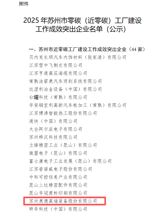 奧德:入選2025年蘇州市零碳(近零碳)工廠建設(shè)工作成效突出企業(yè)